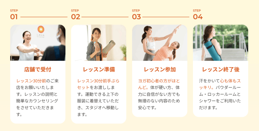 ウェア・タオル・ヨガマットが揃っているので、何も持たずに参加可能です。